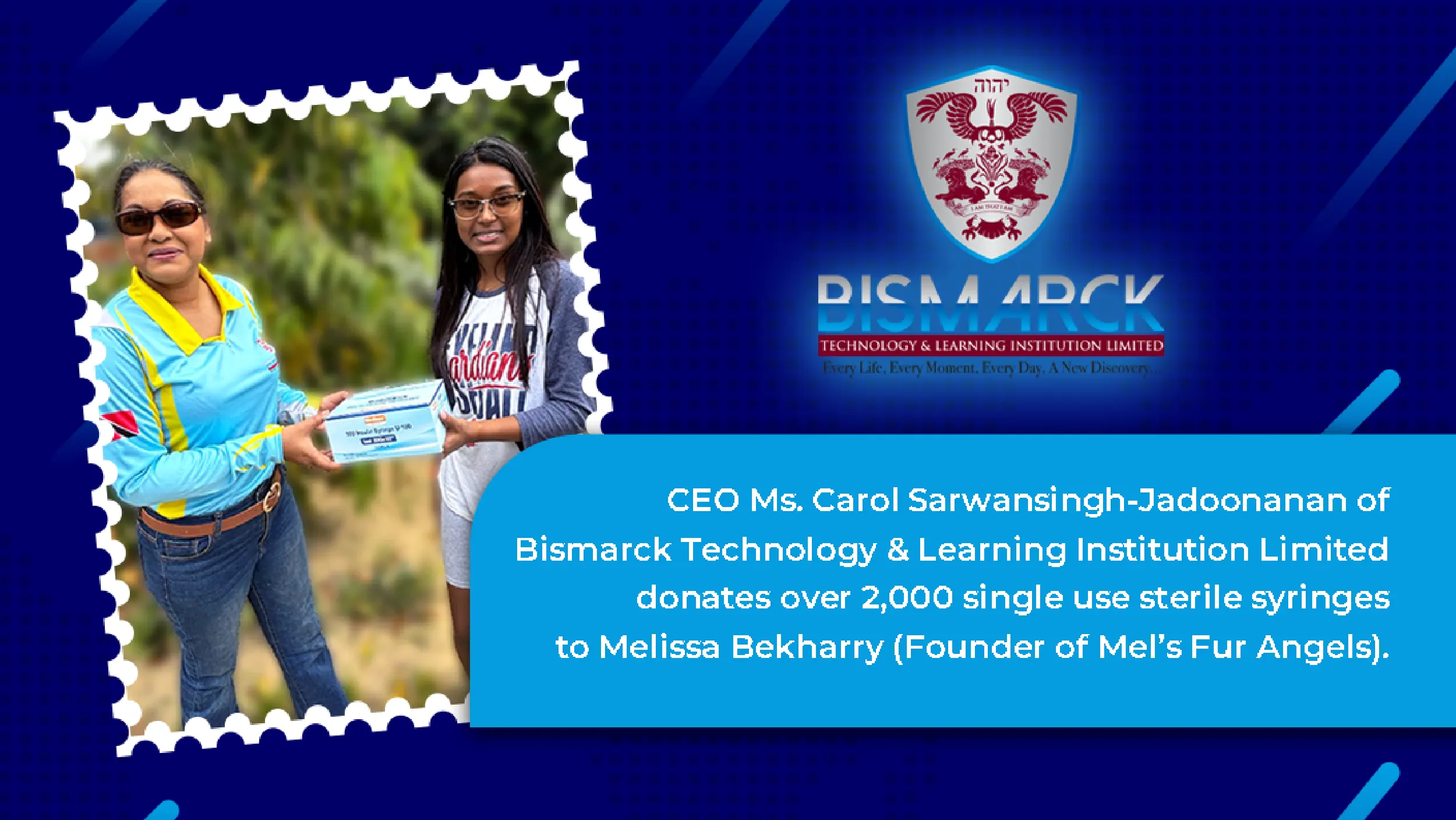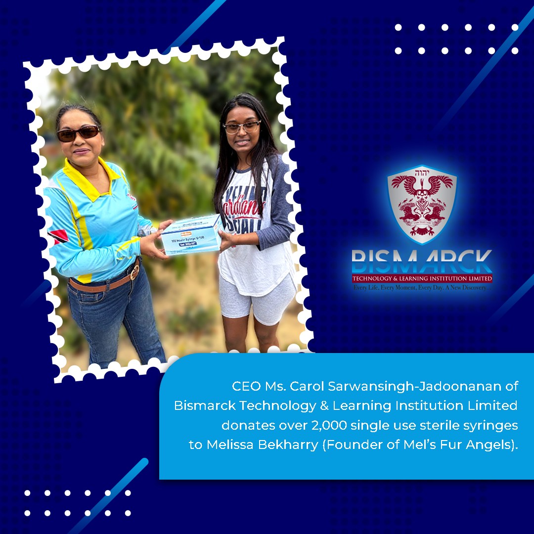 Ms. Carol Sarwansingh-Jadoonanan, CEO at Bismarck Technology & Learning Institution Ltd recently donated 2,000+ sterile syringes to the founder of Mel’s Fur Angels, Melissa Bekharry, supporting the tireless work they do in shelters to help animals in need. These syringes will be used at shelters that house and foster unwanted, sick or injured animals.
